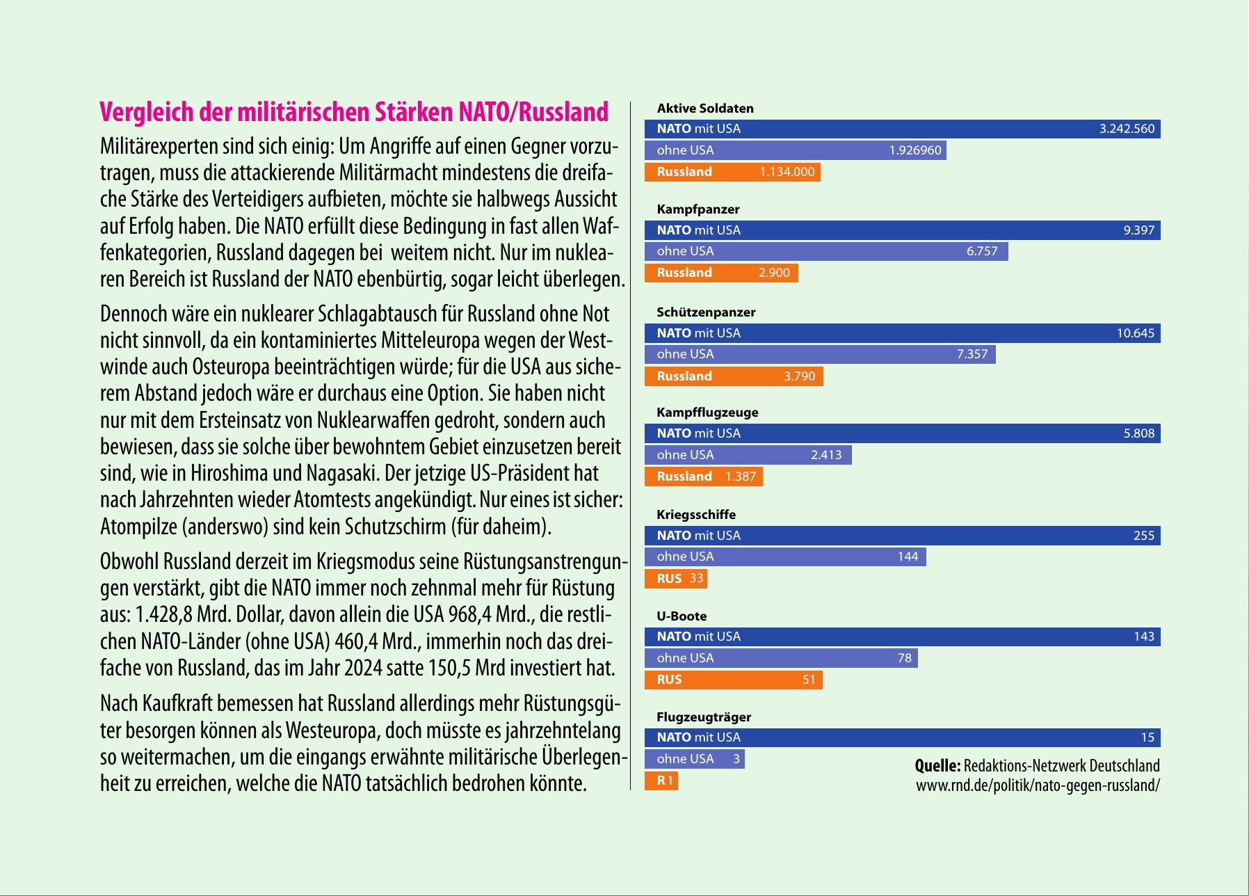 Die Military Balance 2025-Studie1 belegt eine zwei- bis dreifache Überlegenheit der NATO gegenüber Russland im konventionellen Bereich. Selbst die US-Geheimdienste sagen, dass es keine Hinweise darauf gibt, dass Russland die NATO angreifen wolle. Die gegenteilige Behauptung ist reine Propaganda.